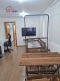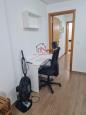 * SALA com piso laminado, mesa, mesa e cadeira para escritório, 01 cama, banco de madeira;TV